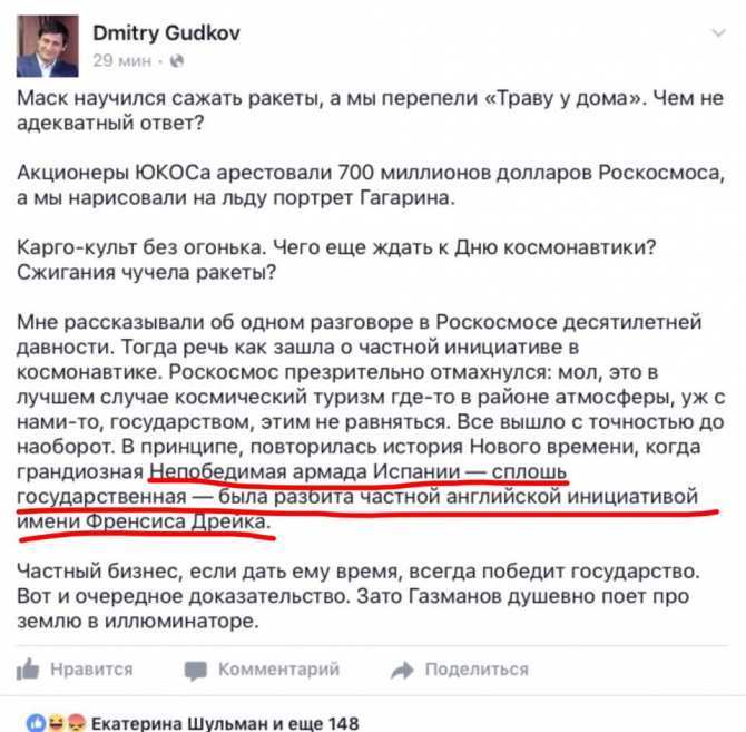 Вчера, в преддверии дня космонавтики, Дмитрий Гудков написал в одной из социальных сетей пост, в котором выразил мысль о том, что Россия губит частные инициативы, но, в конечном итоге, частное все равно будет преобладать над государственным.
