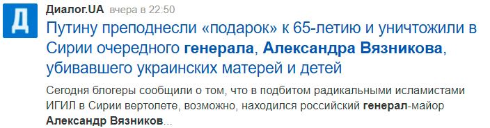 «Putin was presented with general A. Vyaznikov who killed Ukrainian mothers and children» — reads the title of Ukrainian Dialog.ua.